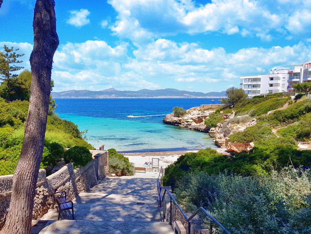 Cala Blava is a small beach in a picturesque bay on the southwest coast of Mallorca. Located in the quiet resort town of Cala Blava, which is 2-3 km south-east of the resort town of S’Arenal. The beach is well protected inside a beautiful small rocky cove. It is covered with fine sand, followed by coarser sand and boulders. The bottom near the water is also sandy and the water gradually gets deeper. Cala Blava is a very cozy beach with fine sand and calm water.