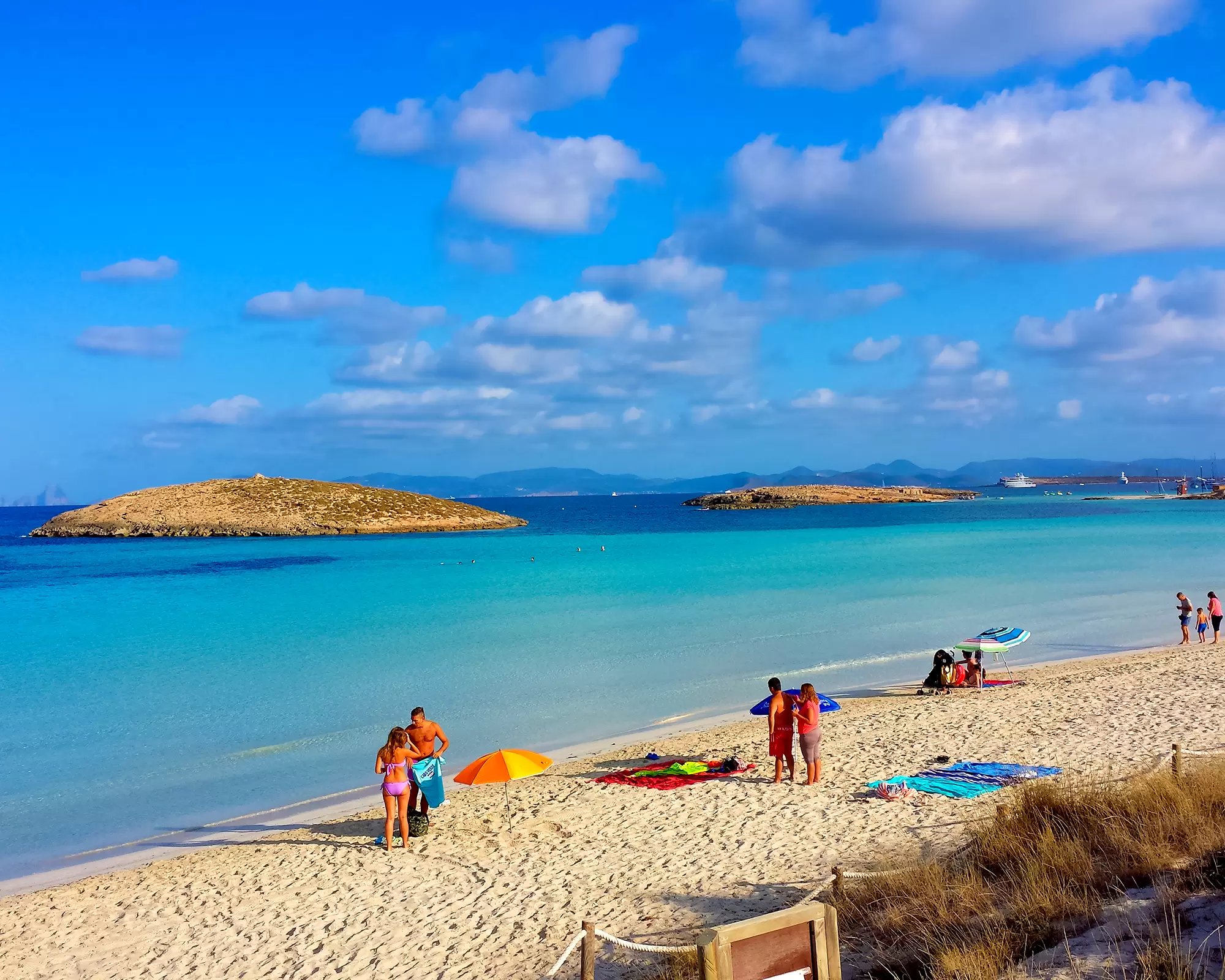 Playa de Illetes beach is famous for its white sand and clear, warm water. Its name comes from the Spanish word «Illetes», which means «small island». Indeed, the beach is surrounded by small islets that create a unique atmosphere and protect it from strong waves.